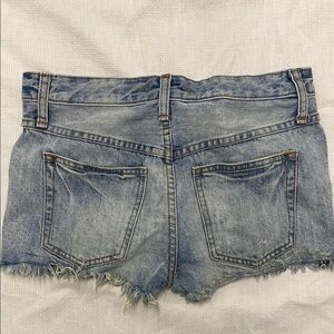Chic light blue jean shorts by Free People. Features frayed hem and button fly. Ideal for casual wear.