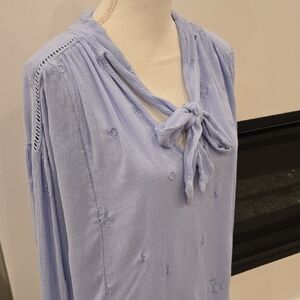 Free People Light Blue Tie Neck Blouse Top Wishful Moments Embroidered - Large