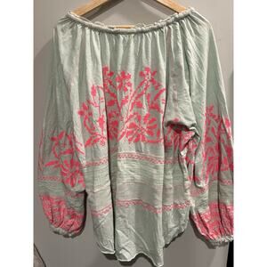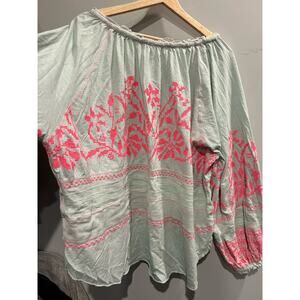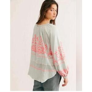 Reposhing this gorgeous Free People top I recently bought on Poshmark—just a little too big for me. Light mint green base with bright pink embroidered floral design. Flowy peasant style with button-front detail and voluminous sleeves. Light and airy, perfect for spring and summer.