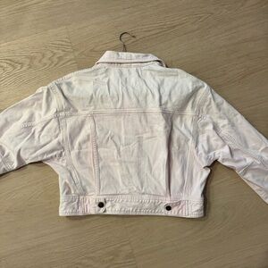 Stylish cropped baby pink jean jacket. Button-up front. Classic collar design. Perfect for layering.