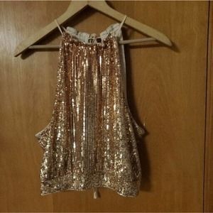 Free People Lights Out Gold Sequin Halter Tank Top Open Tie Back Large EUC
