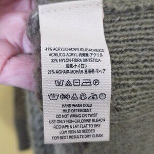 Acrylic, nylon and mohair, measurements are 23" pit to pit and sleeve and 32" length, very loose knit, sheer, lightweight, color is beige, long sleeves, round neck and back, longer length, relaxed hem, fuzzy, oversized, so cute, good condition and quality