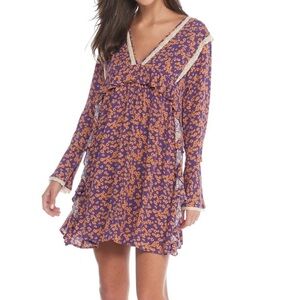 This relaxed mini dress from Free People showcases a vibrant blend of purple and orange hues, enhanced by a pleated design and a distinctive embroidered collar. The long sleeves and flowing silhouette offer a comfortable yet stylish fit, perfect for any casual occasion.