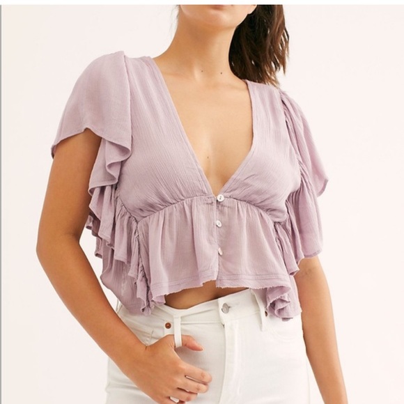 Elevate your style with this lilac ruffle top from Free People. Perfect for any occasion, this top features a deep V-neck and elegant ruffles.