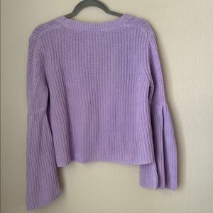 Chic V-neck sweater in soft lilac. Features wide sleeves and ribbed texture. Ideal for layering.