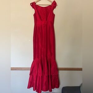 In a gorgeous red this stunning mermaid style taffeta gown features a multi-tiered ruffle hem