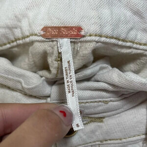 Free People Off White Cream Denim Paper Bag Ruffle Top Mini Skirt Women’s Size 6. Has pockets, belt loops, no belt and a button and zipper front closure. 86% Cotton and 14% Linen. Machine washable. Made in Turkey.