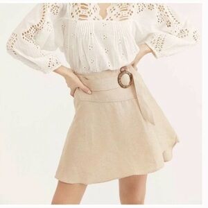 Free People mini skirt in a tan linen blend. Faux belt at front with wooden buckle. Size zipper. Flare style. No liner. Size 8. Excellent condition.