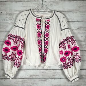 Free People Linen Cotton Bohemian Embroidered Balloon Sleeve Cropped Jacket XS