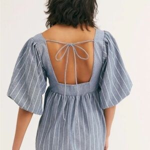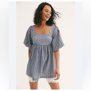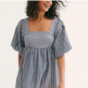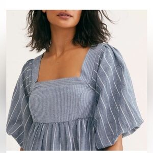 Free People Linen Puff Sleeve Tunic Top Blue Striped Blouse Maternity Babydoll M