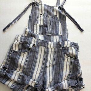 Beachy stripes give a relaxed vibe to a pair of short overalls with roll-tab cuffs and crossed straps.