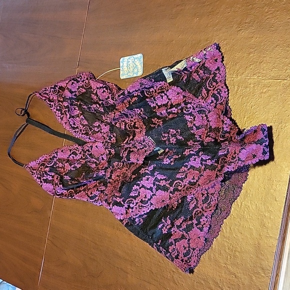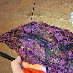 sheer lace body suit. burgundy and black lace. t-strap back. never worn has all tags