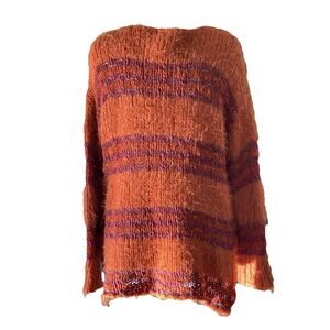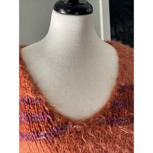The Free People "Linus" Eyelash Chunky Knit Sweater in Orange Stripe, size Medium, is a stylish and cozy addition to any casual wardrobe. This V-neck pullover sweater features a chunky knit design with fuzzy eyelash accents, creating a unique and eye-catching look. Perfect for the winter, fall, and spring seasons, this oversized sweater with a hi-lo bottom offers both comfort and style. Made from a blend of acrylic, nylon, cotton, and wool, this sweater is hand wash only to maintain its quality. Perfect for a boho-inspired look, this sweater is a must-have for any fashion-forward woman.