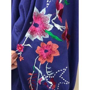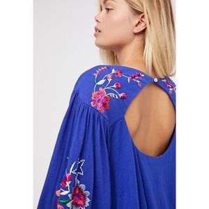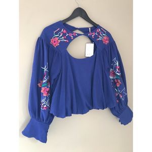 Gorgeous Embroidered top in a cotton-linen blend fabrication featuring front and back cutouts with volume in the body and at the sleeves.