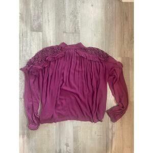 Free People Little Bit Of Love Top size MediumThis relaxed Free People blouse has an oversized silhouette for effortless drape. A gorgeous top that features sheer crochet detailing on the shoulders, flowy silhouette, ruffle trim, and a plunging neckline. Long sleeves with button cuffs. This versatile top can also be worn with jeans, trousers or shorts