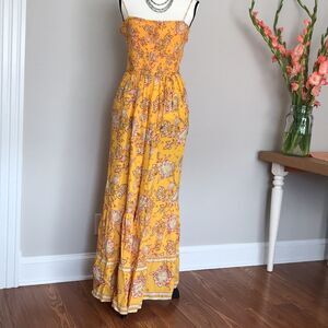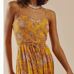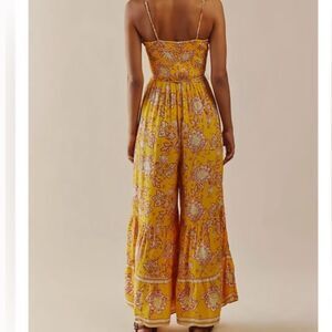 Free People Little Of Your Love Jumpsuit in Marigold Combo features a smocked bodice with adiustable cami straps tie belt at waist, side seam pockets, wide leg with tiered layers and allover floral print.