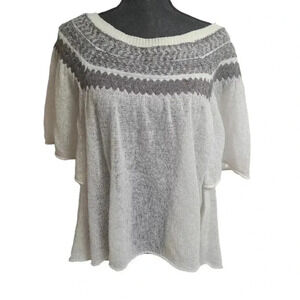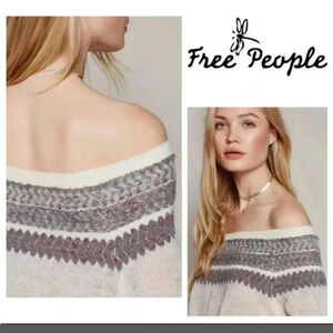 Lightweight sweater with an off-the-shoulder silhouette and semi-sheer fabrication. Wide femme flared sleeves. Multi Pattern print along the neckline.