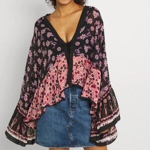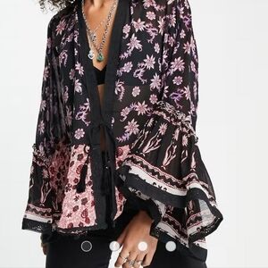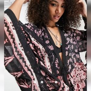 Free People Lola Printed Kimono in Black Small Oversized Fit Mixed Florals