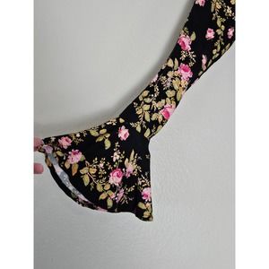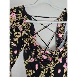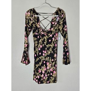 Femme and floral, this essential mini dress features a cowl-inspired neckline and long, belle-style sleeves with lace-up detail at back for added dimension. Please see photos for measurements. MSRP $128