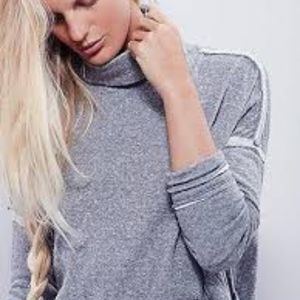Super soft grey marled pullover with raw, exposed seams lend artful details to a drapey pullover topped with a cozy turtleneck. Roll-ready sleeves and a split high/low hem complete the versatile style. In good used condition.
