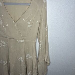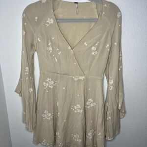 Feminine and flowy Free People mini dress in a soft beige with delicate white floral embroidery. Features a faux wrap front, flattering fit-and-flare shape, and romantic bell sleeves. Lightweight and perfect for layering or wearing on its own year-round.