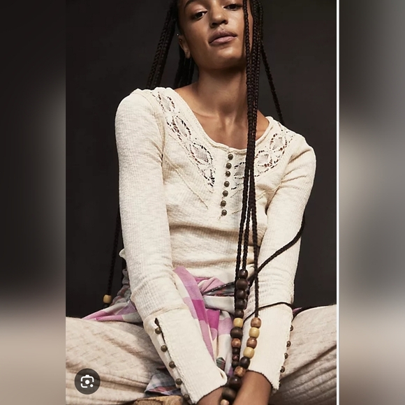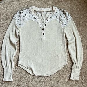 Free People Long Sleeve Henley With Floral Shoulder and Back Embroidered Desigon