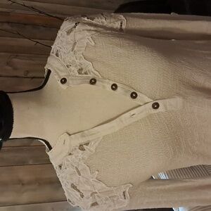 Elegant long sleeve tee. Features lace detailing. Button accents on front and sleeves. Soft and comfortable fabric. Cottagecore Boho Lightweight Preowned