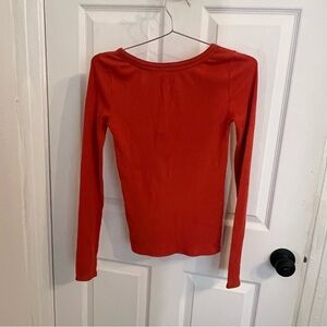 Beautiful coral color long sleeve ribbed knit top from Free People. Unique neckline, bronze tone rivet detail. Gently worn and in great condition. Length 22".
