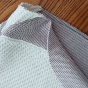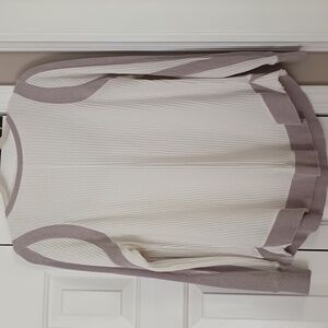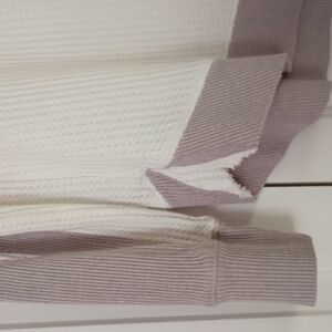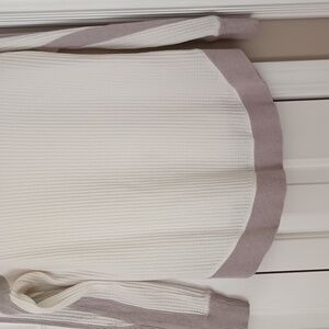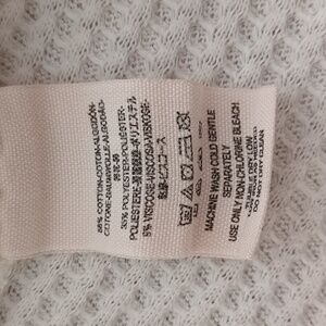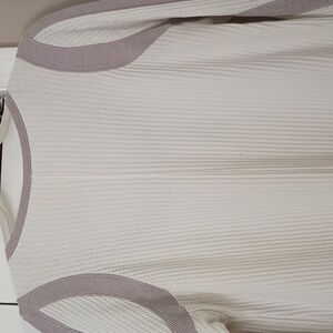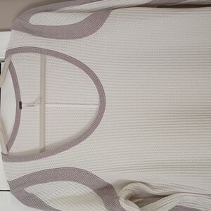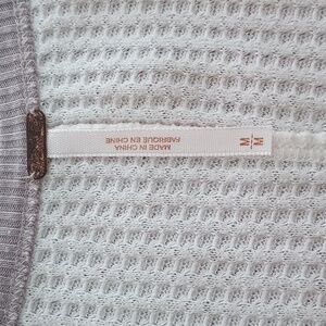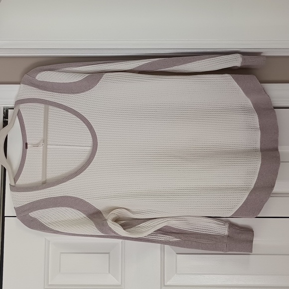 Stylish long sleeve tee by Free People. Features a waffle knit texture. White body with gray accents. Perfect for casual wear. (Item 1035)