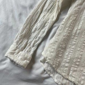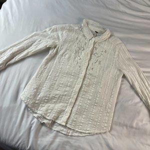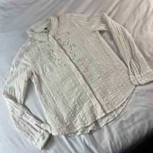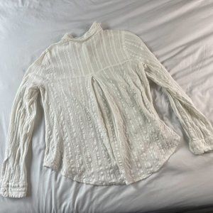 Super cute off-white long sleeve shirt, bottoms down and has a beautiful lace in the front. The fabric itself has a beautiful texture which gives it a very boho vibe.