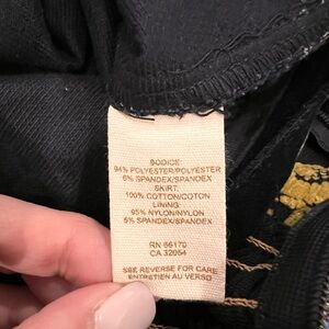 Gold, turquoise, black, yellow, blue, and black velvet with a bronze bodice and a side zipper.
