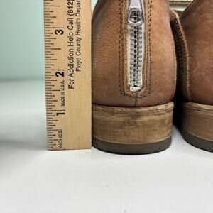 Free People Lost Valley Strappy Ankle Boot Pointed Toe Brown zips at the back of the heel to close. Has a medium chunky, stacked heel.