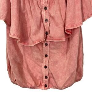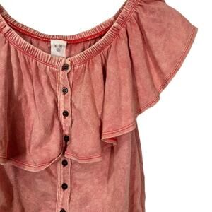 Free People Love Letter Ruffled Tube Top. Off the shoulder ruffle top. Button front. Elasticized top and hem. Distressed coral color. We The Free.