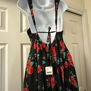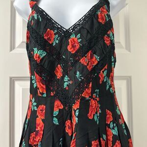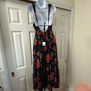 Discover allure in the Free People x Revolve Lovers Heart Midi. Black with a red rose pattern, its flowy fabric, bodice lace, and back tie exude romance. Perfect for summer parties, it combines comfort with style, complete with handy pockets.