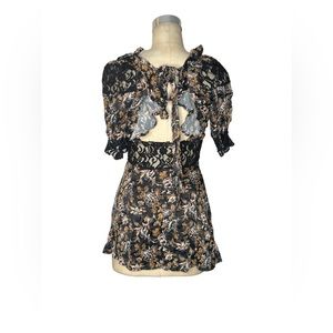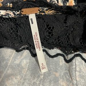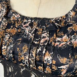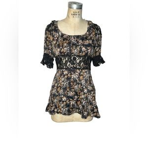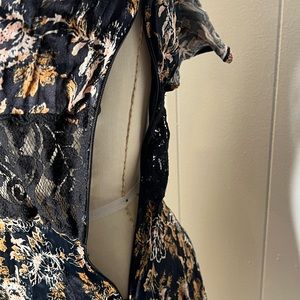 Black, orange and pink floral print. Lace sleeve and waist details. Hidden side zipper