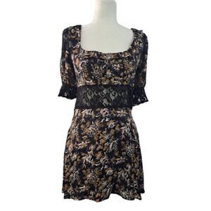 Free People Lucie Mini Dress Black Yellow Multi Short Puff Lace Sleeve Sz 4