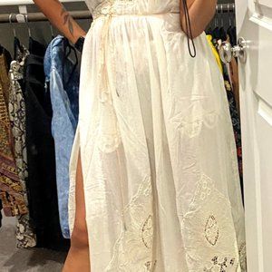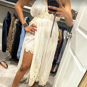 Lovely in a lace-adorned design, this essential maxi set features a cross-front, maxi-length top with contrast waist tie detail and matching shorts for a forever femme look.