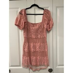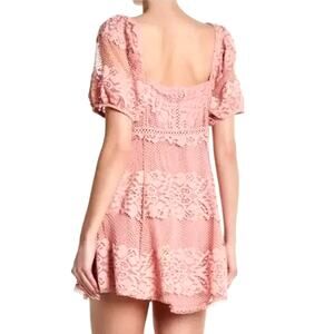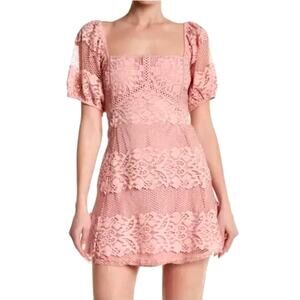 Free People M Lace Be Your Baby Mini Dress Puff Sleeve Square Neck Mauve Pink