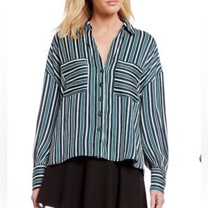 Free People OB890642 Button Up Button Down Shirt Vietnam Womens Split Button Closure Not Specified 100% Polyester Barrel Cuff.Chest Pocket(s) Stripes All Seasons