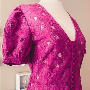 NWOT. Never worn. Feminine magenta floral lace peplum puff sleeve top with button details. The top is unlined and perfect for layering. The lace fabric is thicker than most so it is not a delicate weave that will snag or wear easily. Super cute and a very flattering color.