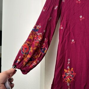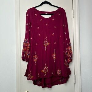 Free People Magenta Pink Oxford Mini Dress Boho Embroidered Long Sleeve Size XS