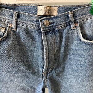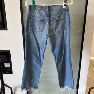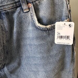 100% cotton. Made in Turkey. Machine wash. Button fly. 5-pocket styling. Destroyed hem. 18" at the knee narrows to 17.5" at the leg opening.