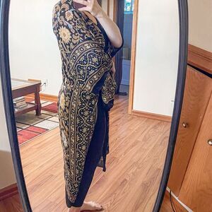 Features an open front with sleeves, long square shape, unlined, can be worn with arms in sleeves or sleeves tied together for a cozier fit, floral with border pattern