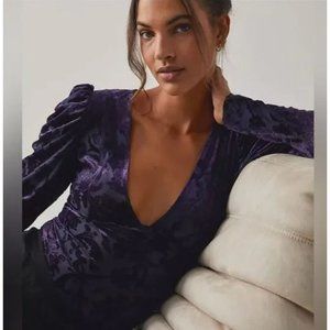 Features: Textured velvet fabrication, deep V-neckline, long-sleeves with puffed detailing
