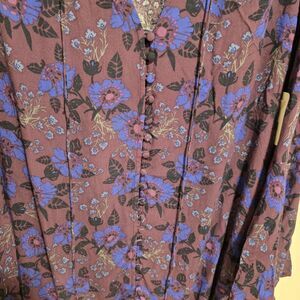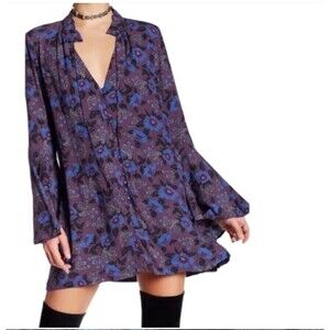 Free People Magic Mystic Tunic Top Mini Dress. Purple floral pattern. Button front. Long bell sleeve.