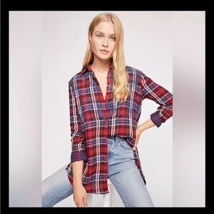 Free People Magical Plaid Shirt XS Embroidered Red Blue