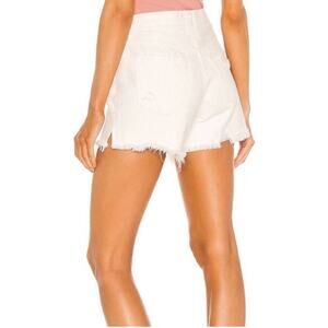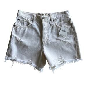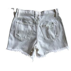 Feathery frayed hems punctuate these faded high-waist shorts designed with edgy distressing for casual-cool days.