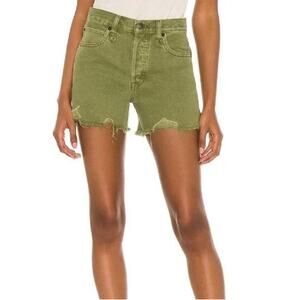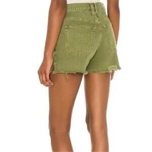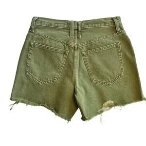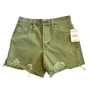 Feathery frayed hems punctuate these faded high-waist shorts designed with edgy distressing for casual-cool days.