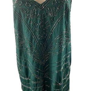 Dare to make your move in this slinky, slip dress, cut with low, dipping, neckline and covered in eye, catching beating, V-neck, adjustable spaghetti straps, all over bead and sequin design size Small Petite