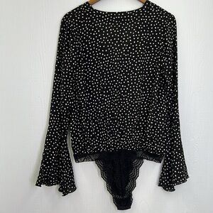 Free People - Making Waves Deep V Neck Bell Sleeve Black And Cream Polka Dot Lace Bodysuit Size Small